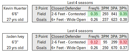 The biggest statistical difference that stands out is the shooting profile. Over the last four seasons, Huerter has taken roughly three times as many contested threes as Ivey, and hit them at a slightly higher percentage (although Huerter has no doubt been in a slump). Ivey’s shooting numbers look solid in wide-open situations, but he hasn’t shown the same ability to hit under pressure yet.